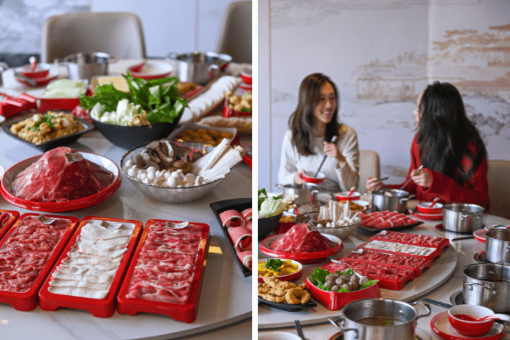At the centre of every table sits a simmering pot of broth, where diners cook their own selection of ingredients. From thinly sliced wagyu beef to seafood, vegetables and noodles, the experience turns dinner into a shared activity.
