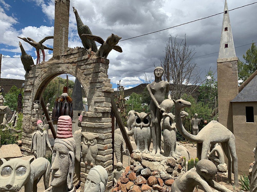 The Owl House isn’t just Nieu-Bethesda’s claim to fame; it is its beating heart. Step through its gates and you’ll find yourself in a world of glass, cement, and imagination. Created by Helen Martins, the Owl House is part dreamscape, part sanctuary, a haunting yet beautiful maze of mirrored suns, concrete owls, and camel caravans frozen mid-journey. Every corner glitters with fragments of light, like pieces of her soul scattered in the Karoo dust. Outside, local crafters keep her legacy alive, selling handmade pieces that echo the same spirit, proof that creativity never really dies; it just finds new hands.